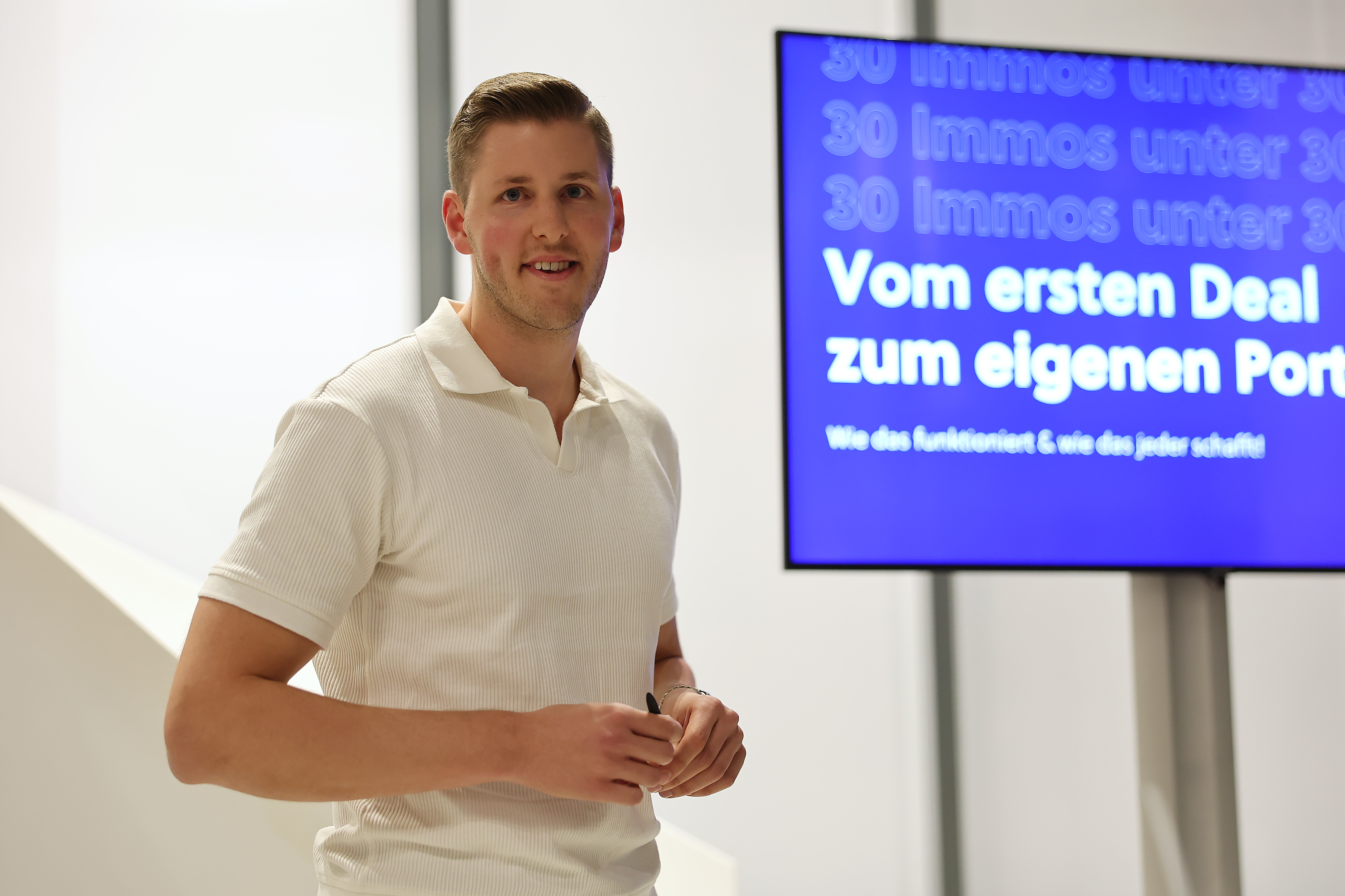 Ein besonderes Highlight des Abends war die Keynote von Sebastian Geiger unter dem Titel „30 Immobilien unter 30“. Offen und authentisch schilderte er seinen Weg vom absoluten Einsteiger zum Immobilieninvestor – und wie er bereits mit 28 Jahren ein umfangreiches Portfolio aus Bestandsimmobilien aufgebaut hat. Seine Geschichte zeigte eindrucksvoll, was mit Wissen, Disziplin und einer klaren Strategie möglich ist.